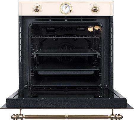 Духовой шкаф BK 60.3 в ретро-стиле с объемом 73 л оснащен 7 режимами нагрева, включая нижний нагрев с конвекцией для равномерного пропекания выпечки. Двухуровневые телескопические направляющие облегчают загрузку тяжелых противней. Четкий механический контроль и TFT-дисплей обеспечивают точные настройки. Тройное остекление дверцы и система охлаждения гарантируют безопасность. Функция отложенного старта и таймер с сигналом упрощают планирование готовки.