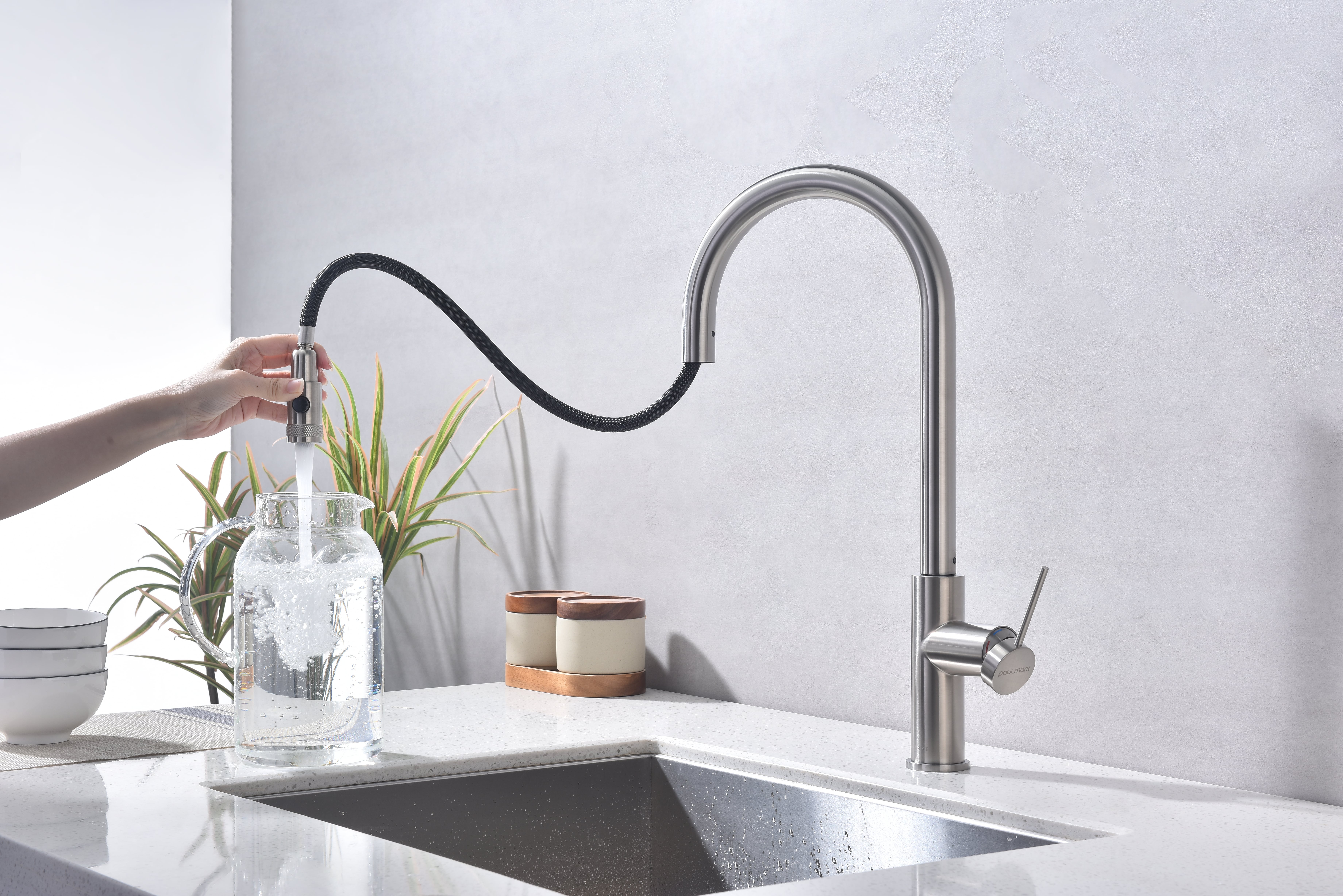Смеситель в современном стиле GALANT с функцией подключения фильтра питьевой воды и выдвижным изливом. Подача очищенной воды включается кнопкой на конце излива. Излив выдвигается на расстояние до 60 см, что позволяет наполнять питьевой водой емкости рядом с мойкой. Кроме того, выдвижной излив облегчает уход за мойкой, позволяя ополоснуть каждый ее уголок.