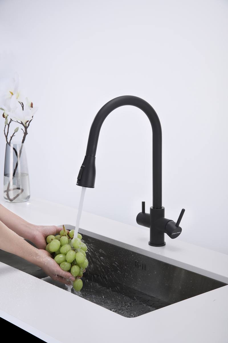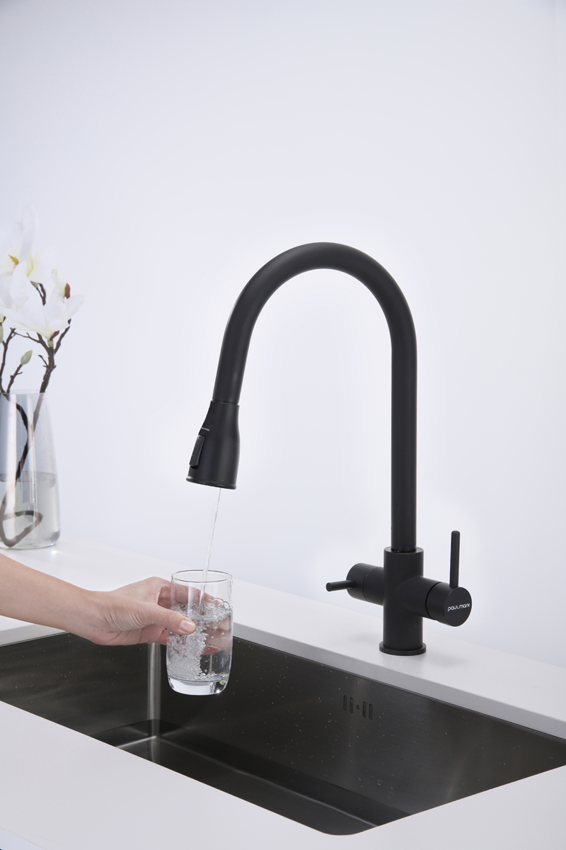 Смеситель LANGE оснащен функциями подключения фильтра питьевой воды, выдвижения излива и двумя режимами подачи водопроводной воды: струя и душ.