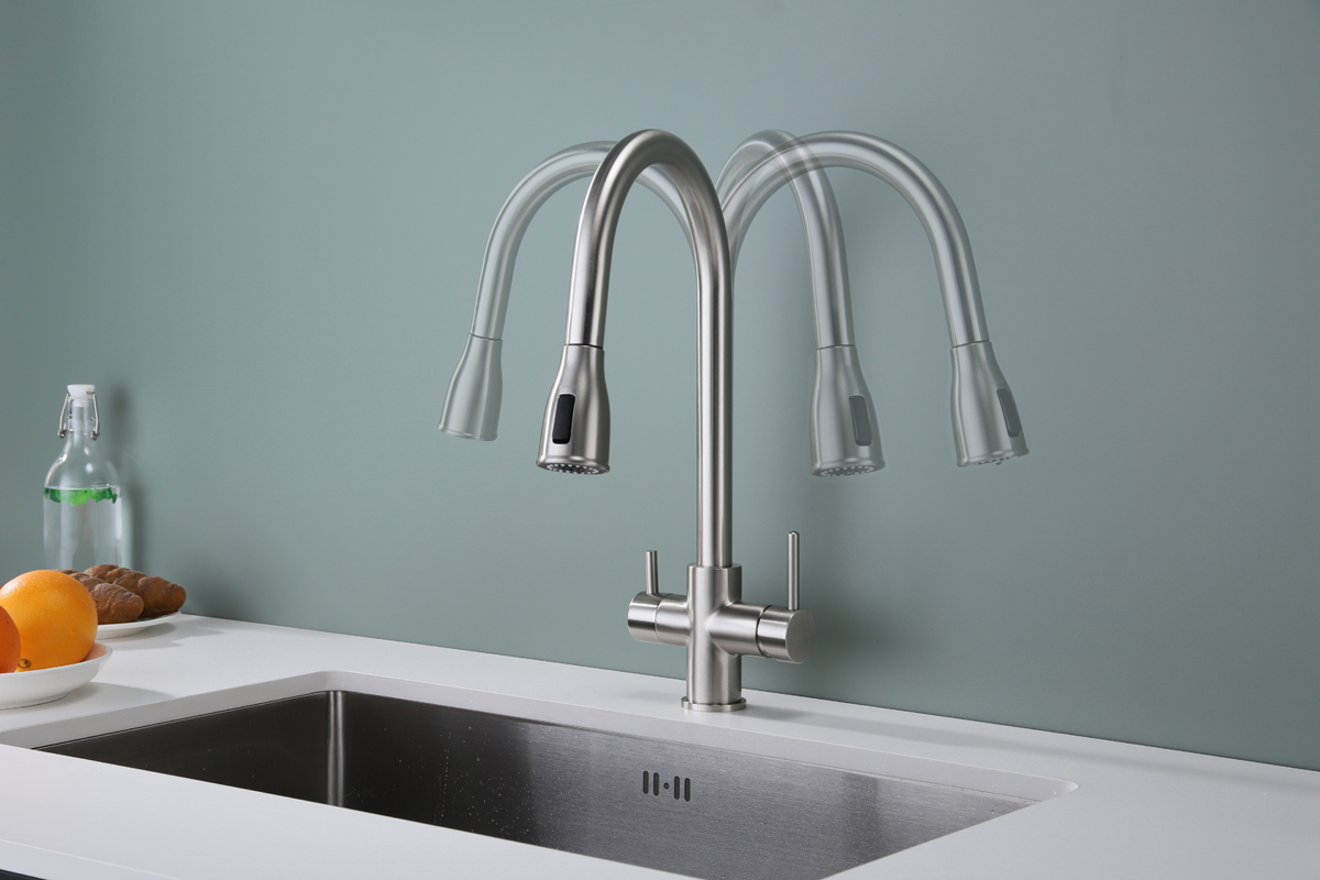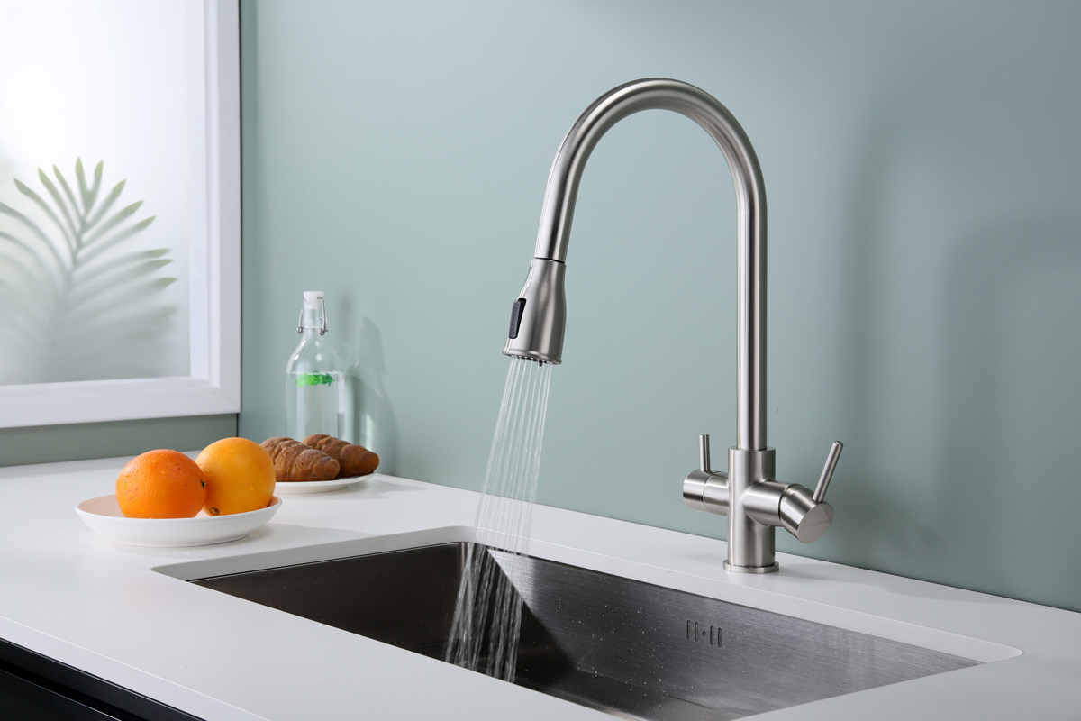 Смеситель LANGE оснащен функциями подключения фильтра питьевой воды, выдвижения излива и двумя режимами подачи водопроводной воды: струя и душ.