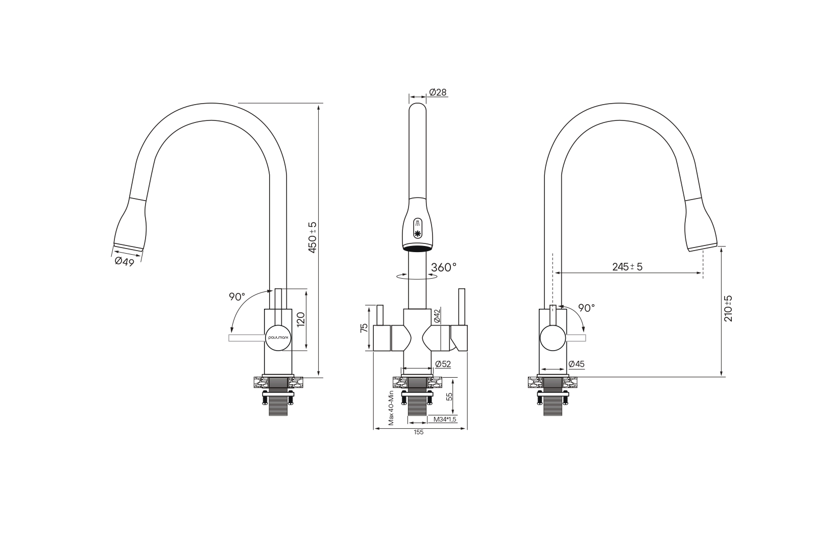 Смеситель LANGE оснащен функциями подключения фильтра питьевой воды, выдвижения излива и двумя режимами подачи водопроводной воды: струя и душ.