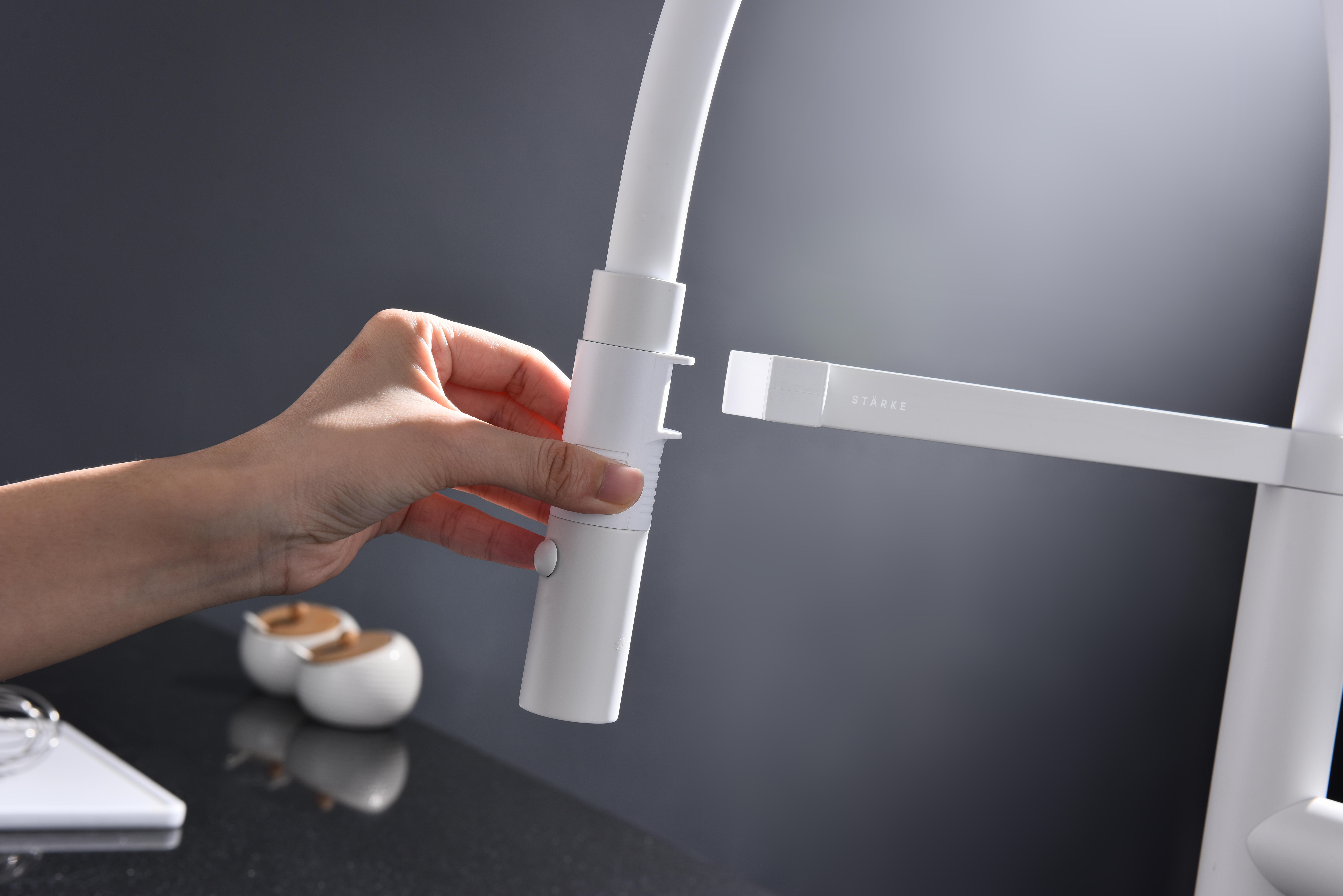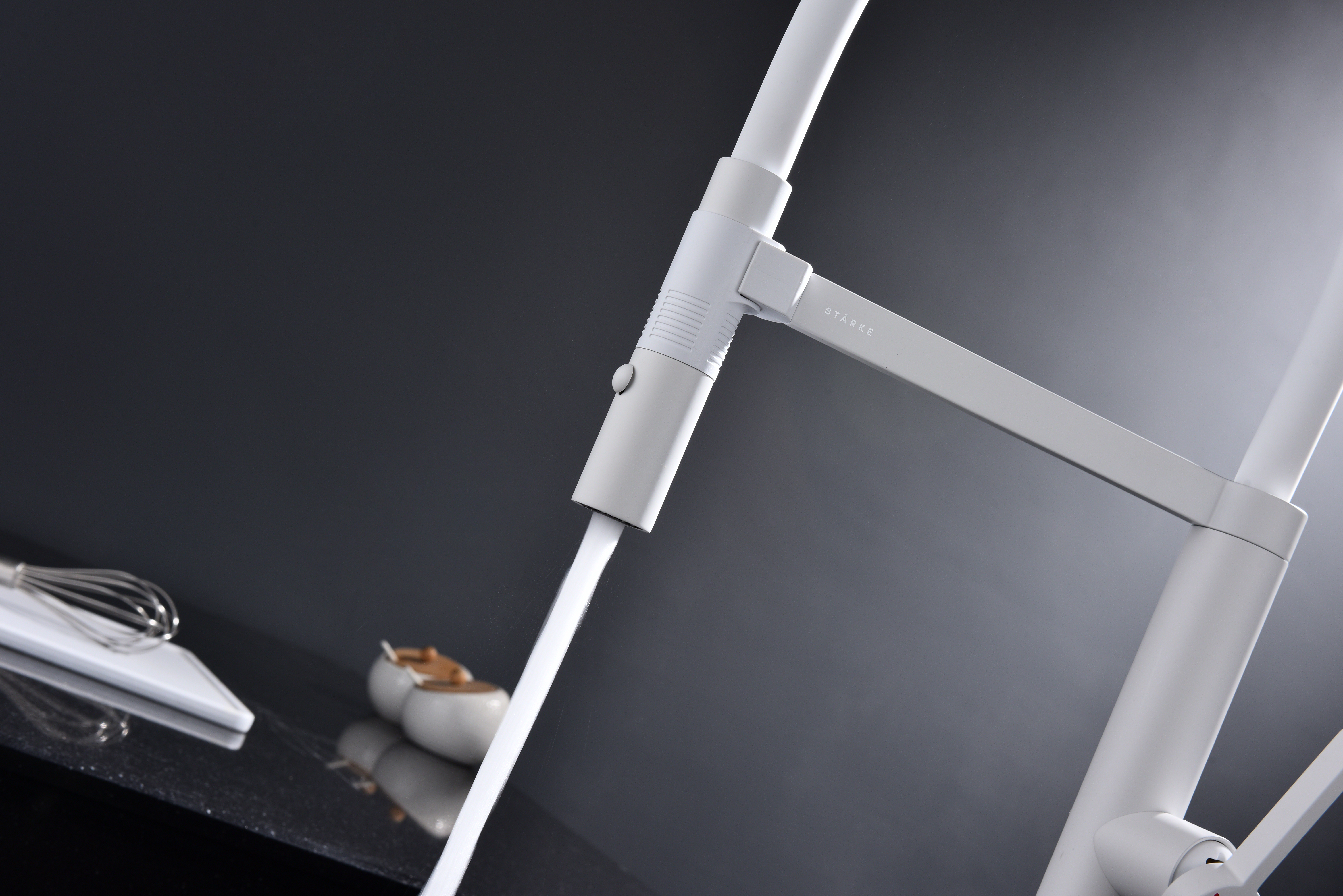 Излив смесителя выполнен из высокопрочного силикона. Конструкцией предусмотрен магнитный механизм фиксации излива.