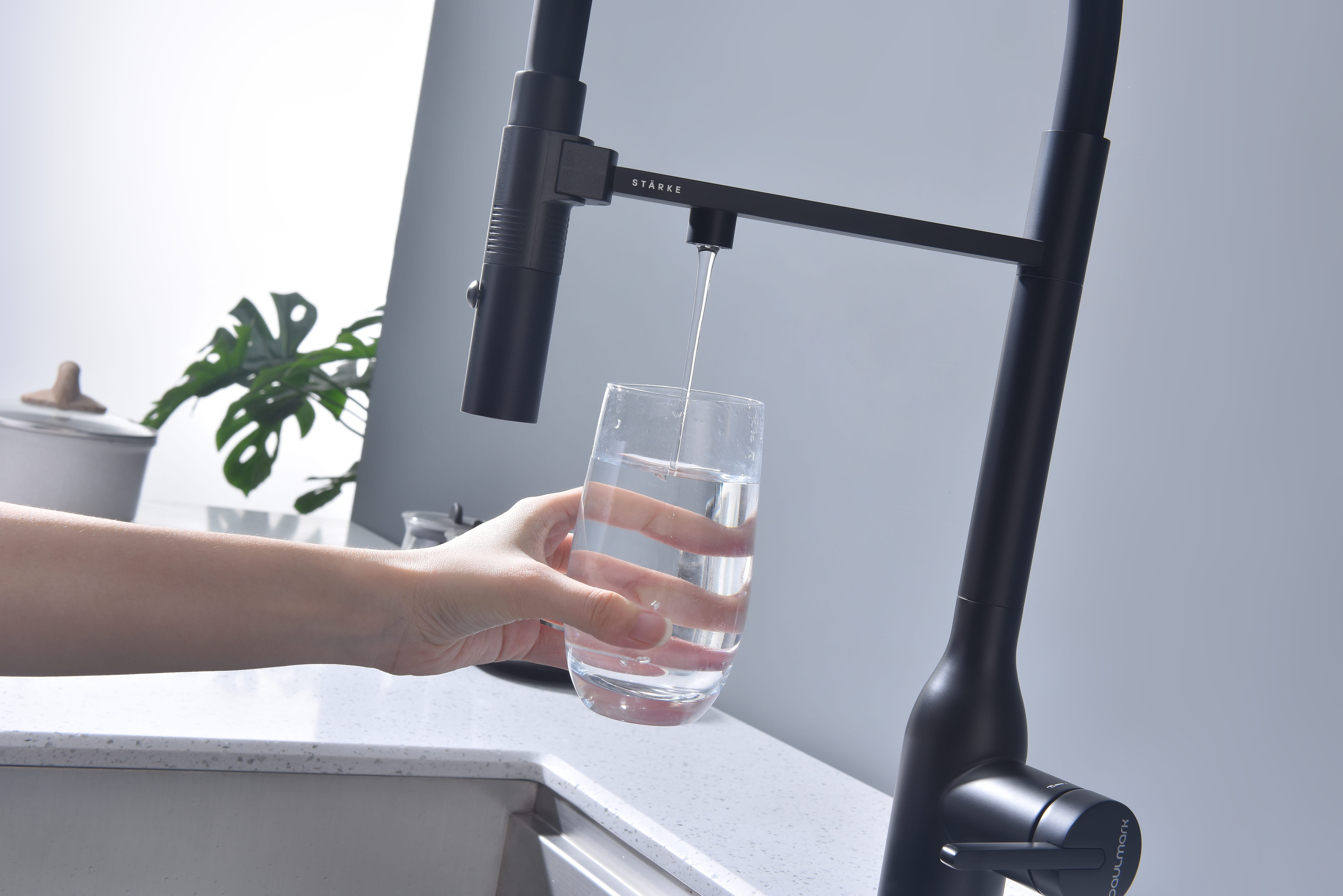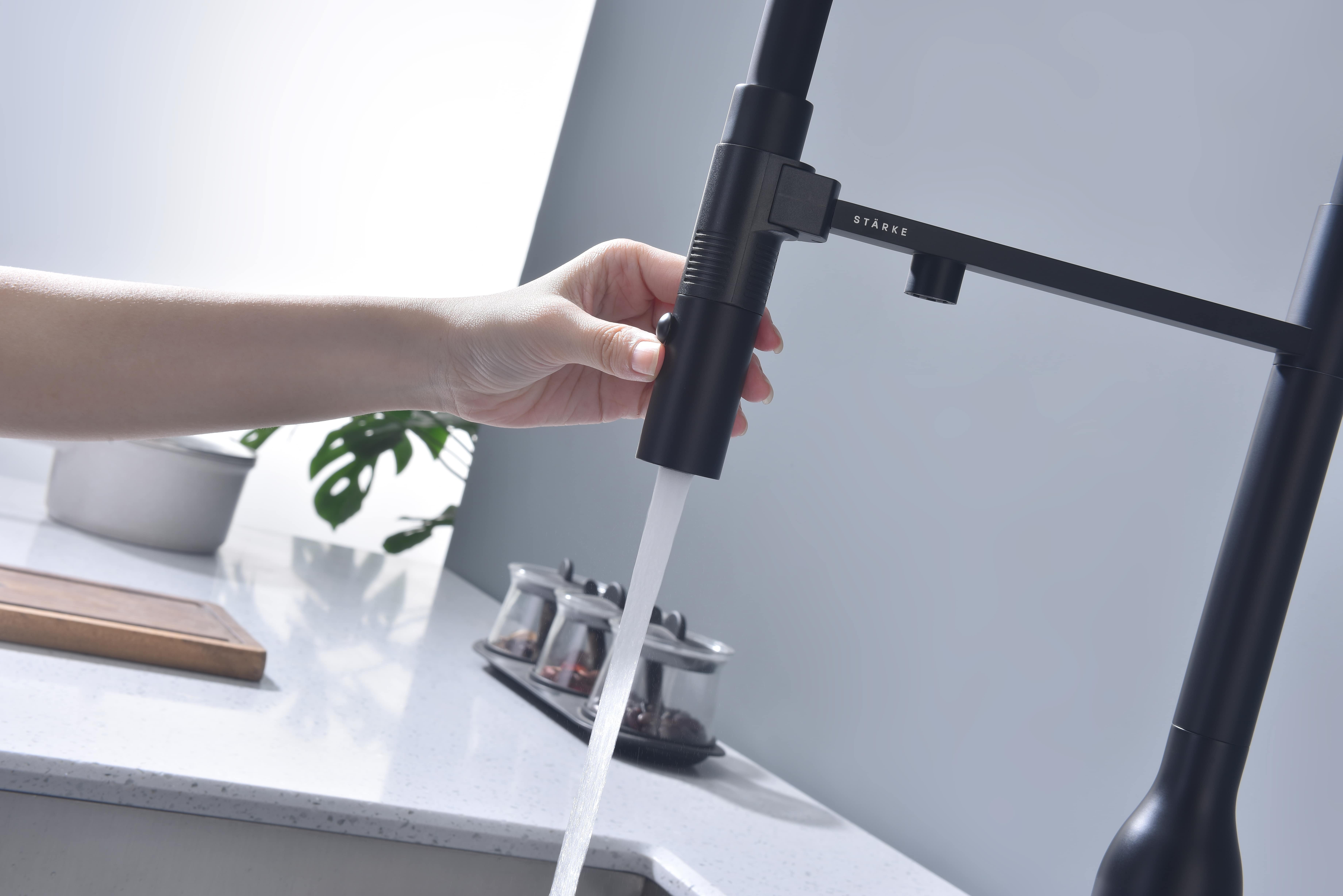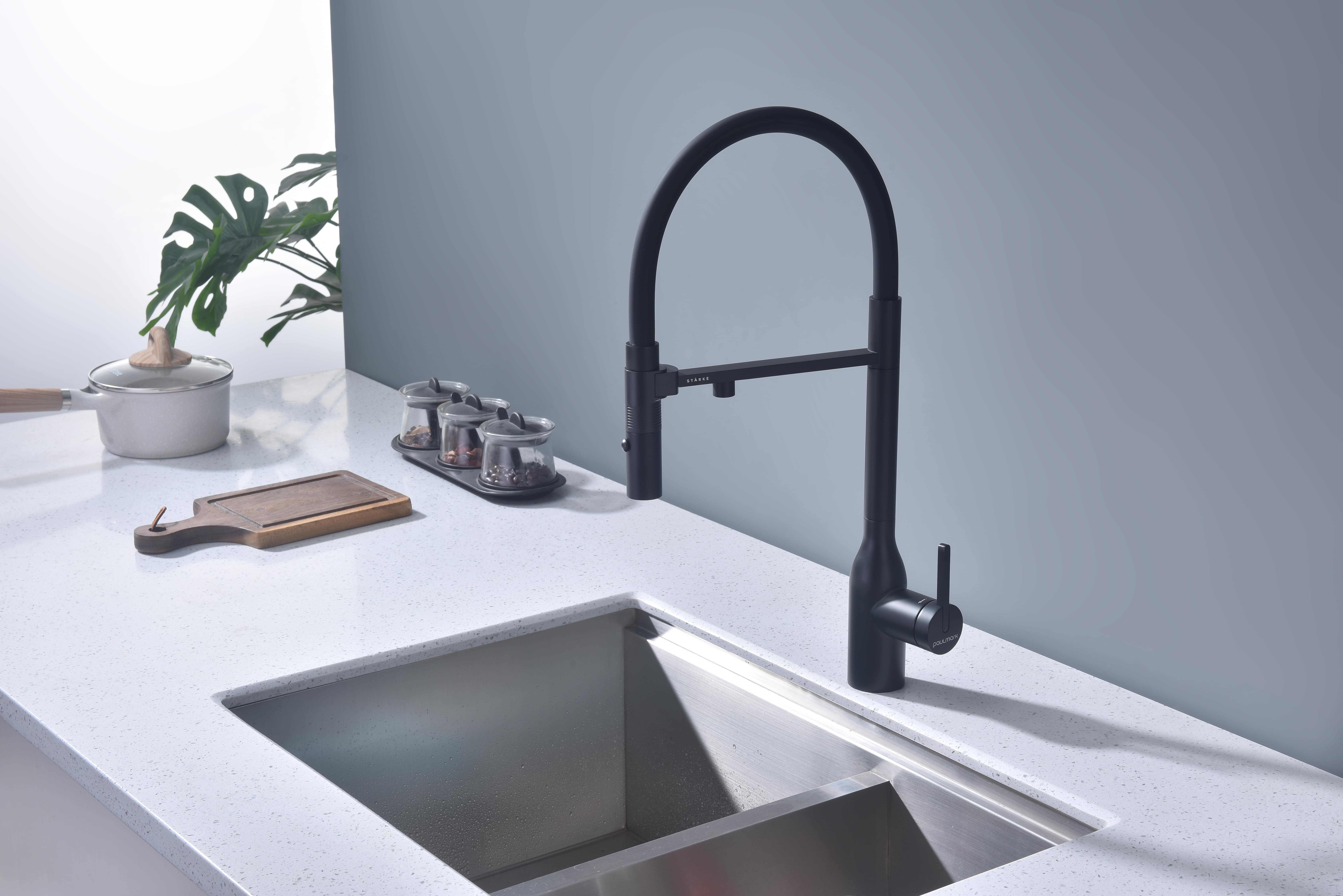 Смеситель для кухни MAGNETO ONE оснащен функциями подключения фильтра питьевой воды, гибким силиконовым изливом с магнитным механизмом крепления и функцией переключения режимов подачи воды струя/душ, управление которой производится кнопкой на конце излива. Рычаг 2в1 управляет подачей водопроводной воды и очищенной воды из фильтра.