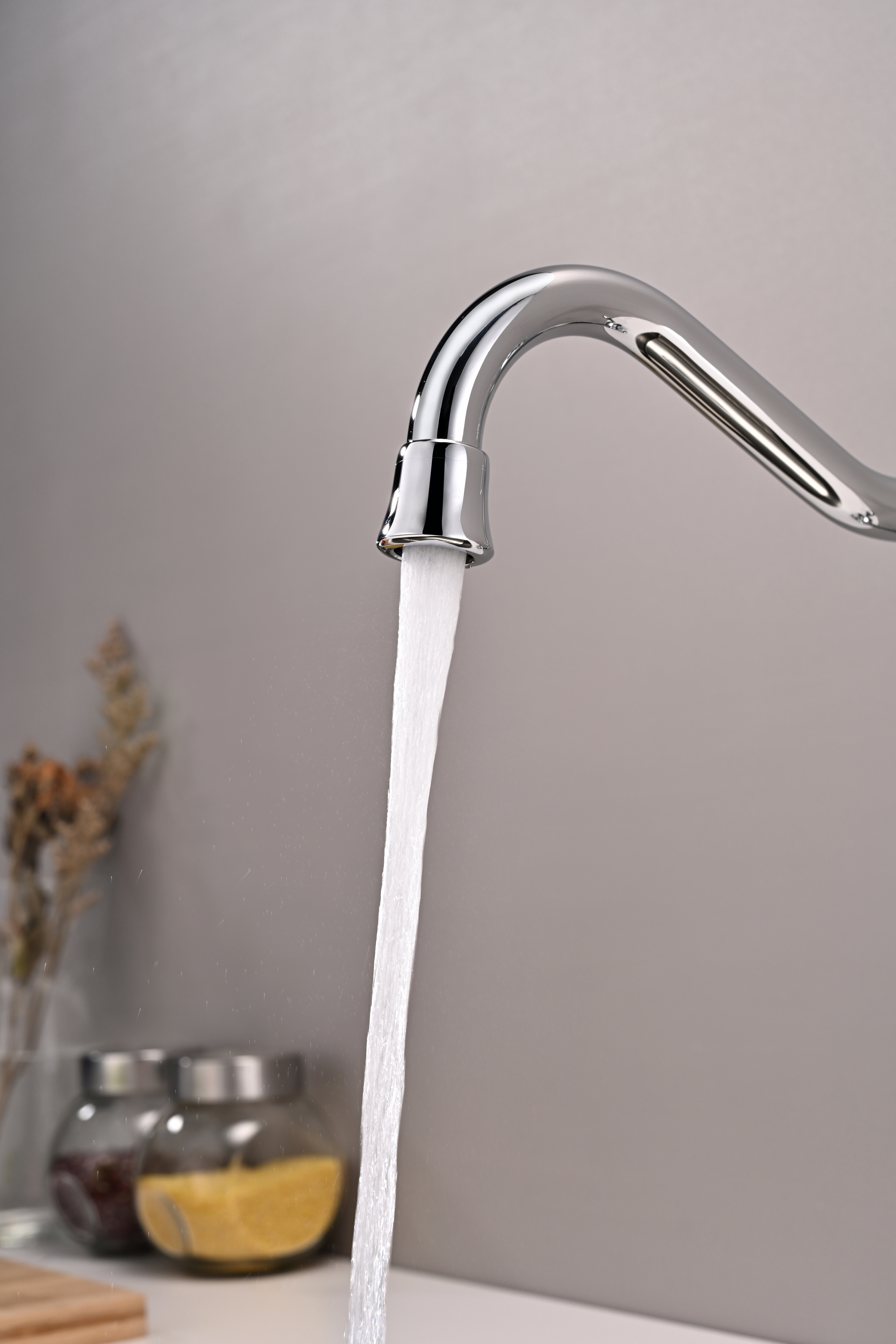 Излив смесителя способен вращаться на 360 градусов, обеспечивая удобство использования.