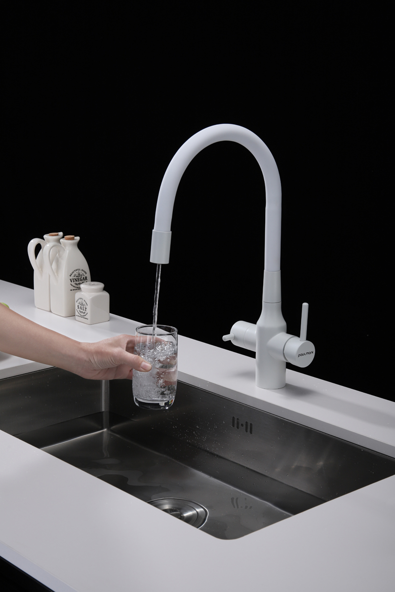 Смеситель для кухни SALIX c возможностью подключения системы фильтрации питьевой воды изготовлен из высококачественной латуни, которая отвечает высочайшим европейским стандартам качества, не содержит свинца, не разрушается со временем и безопасна для здоровья.