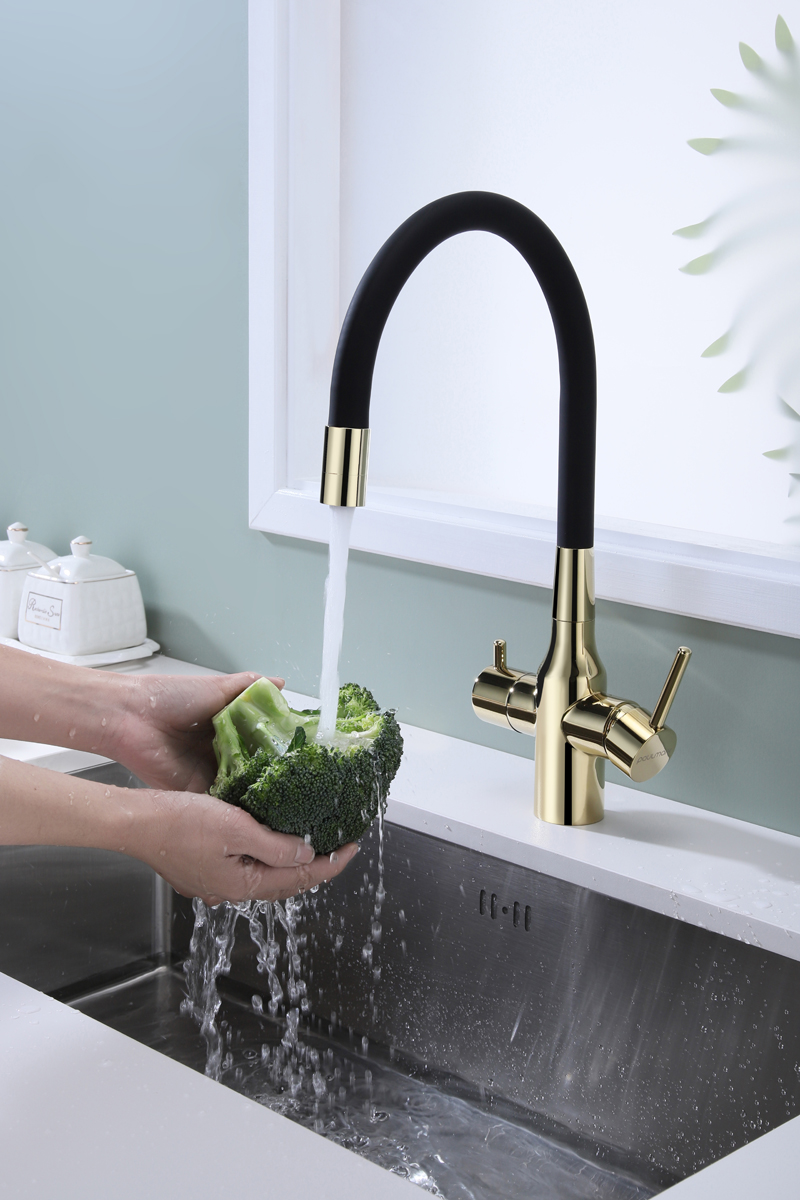 Смеситель для кухни SALIX c возможностью подключения системы фильтрации питьевой воды изготовлен из высококачественной латуни, которая отвечает высочайшим европейским стандартам качества, не содержит свинца, не разрушается со временем и безопасна для здоровья.