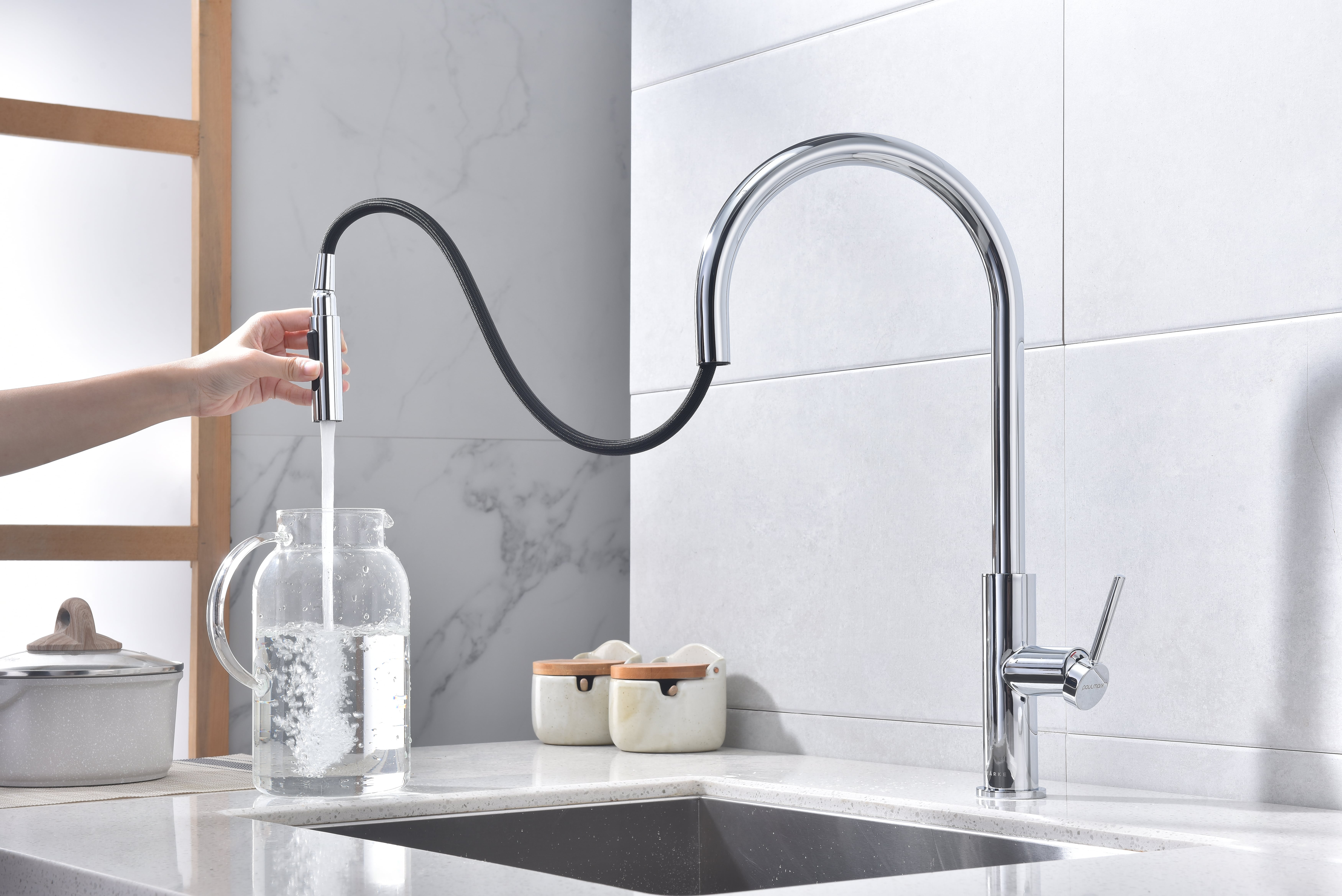 Помимо подачи стандартной струи, смеситель оснащен функцией подачи воды в режиме «душ» для идеального промывания посуды и продуктов
