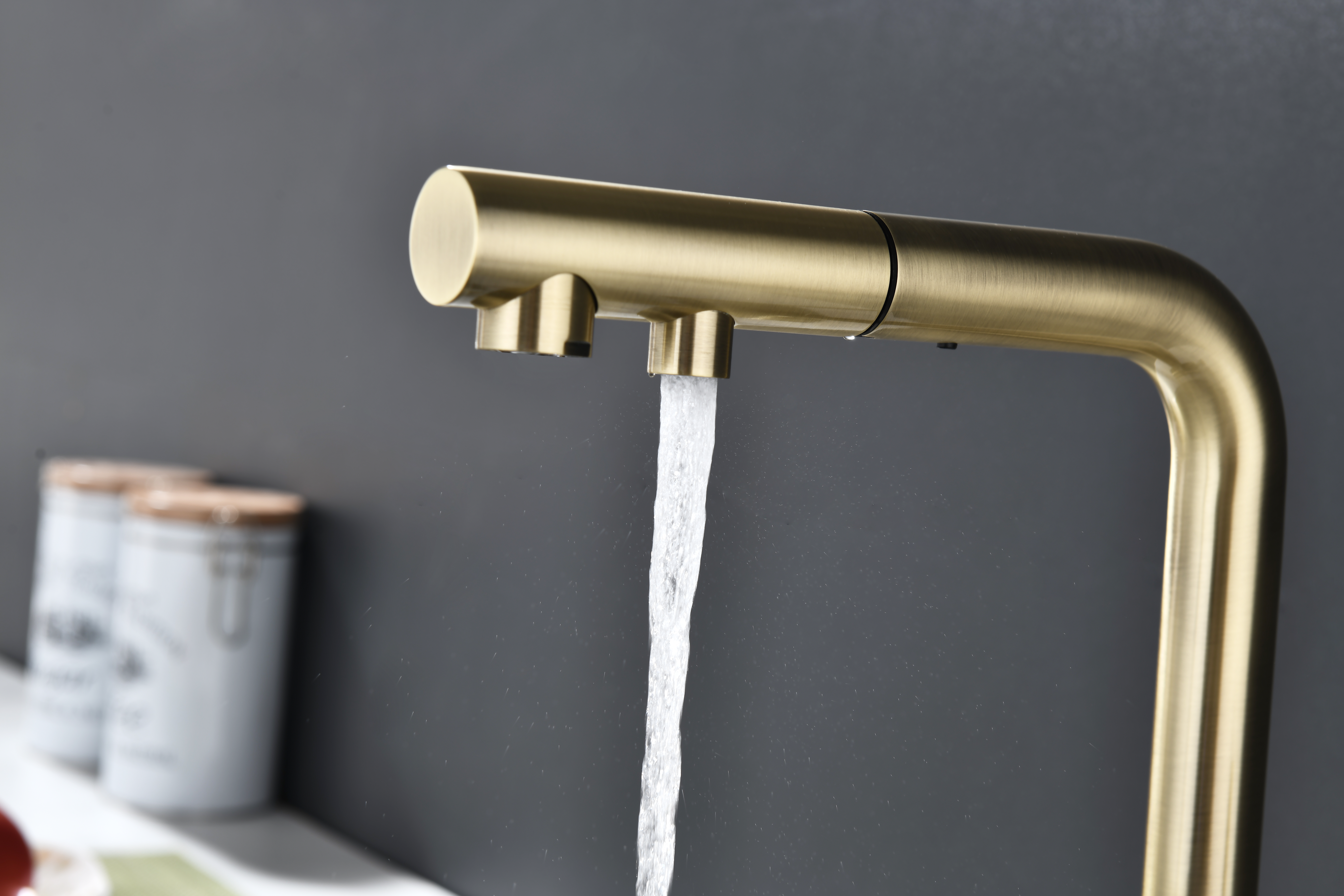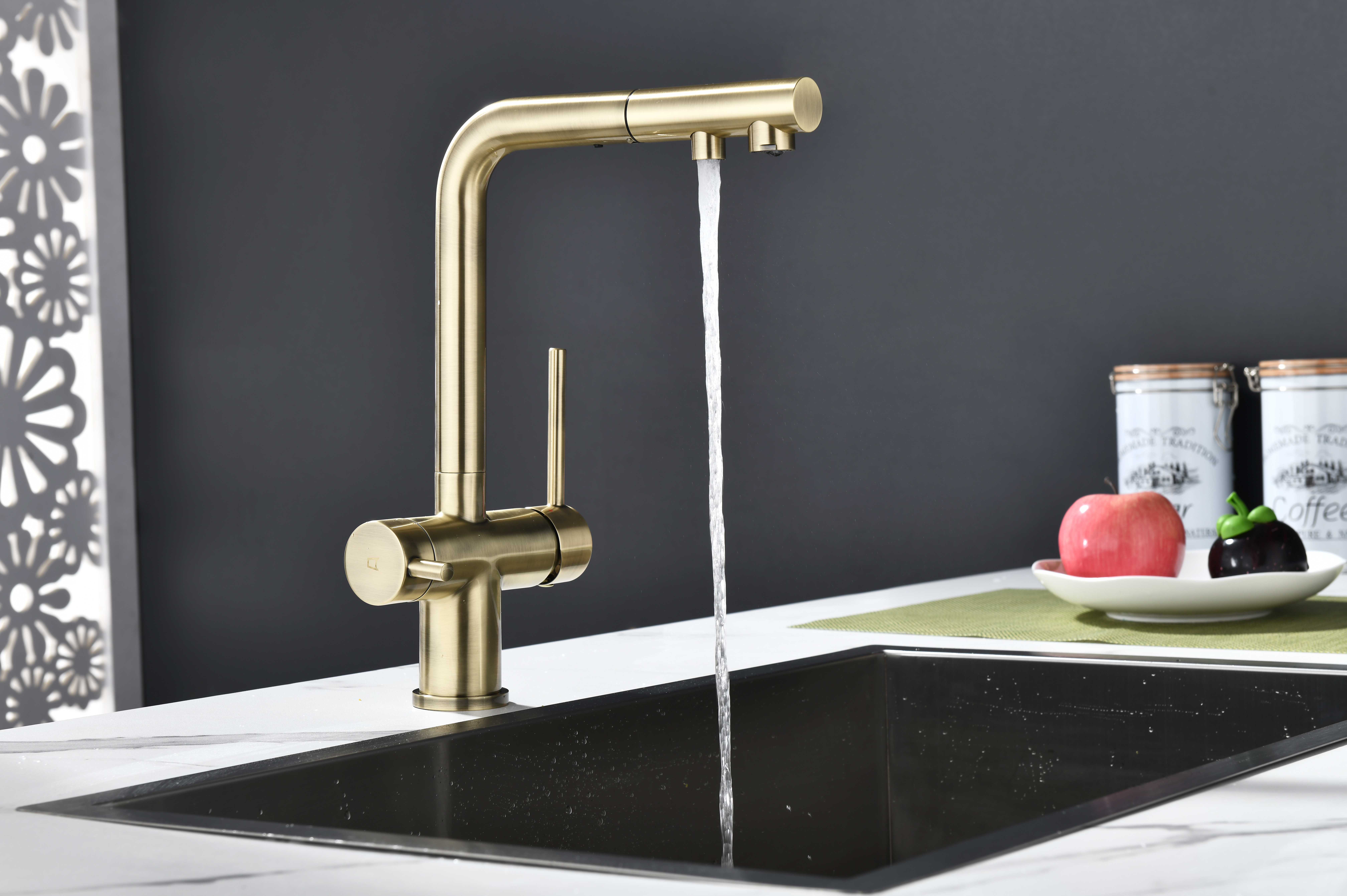 SERPENTINE оснащён функцией TRINKWASSER - излив смесителя имеет встроенный независимый канал для питьевой воды из фильтра, таким образом питьевая и водопроводная вода не смешиваются. Управление питьевой водой осуществляется отдельным рычагом, расположенным слева. Для пуска водопроводной воды используется большой рычаг справа.
