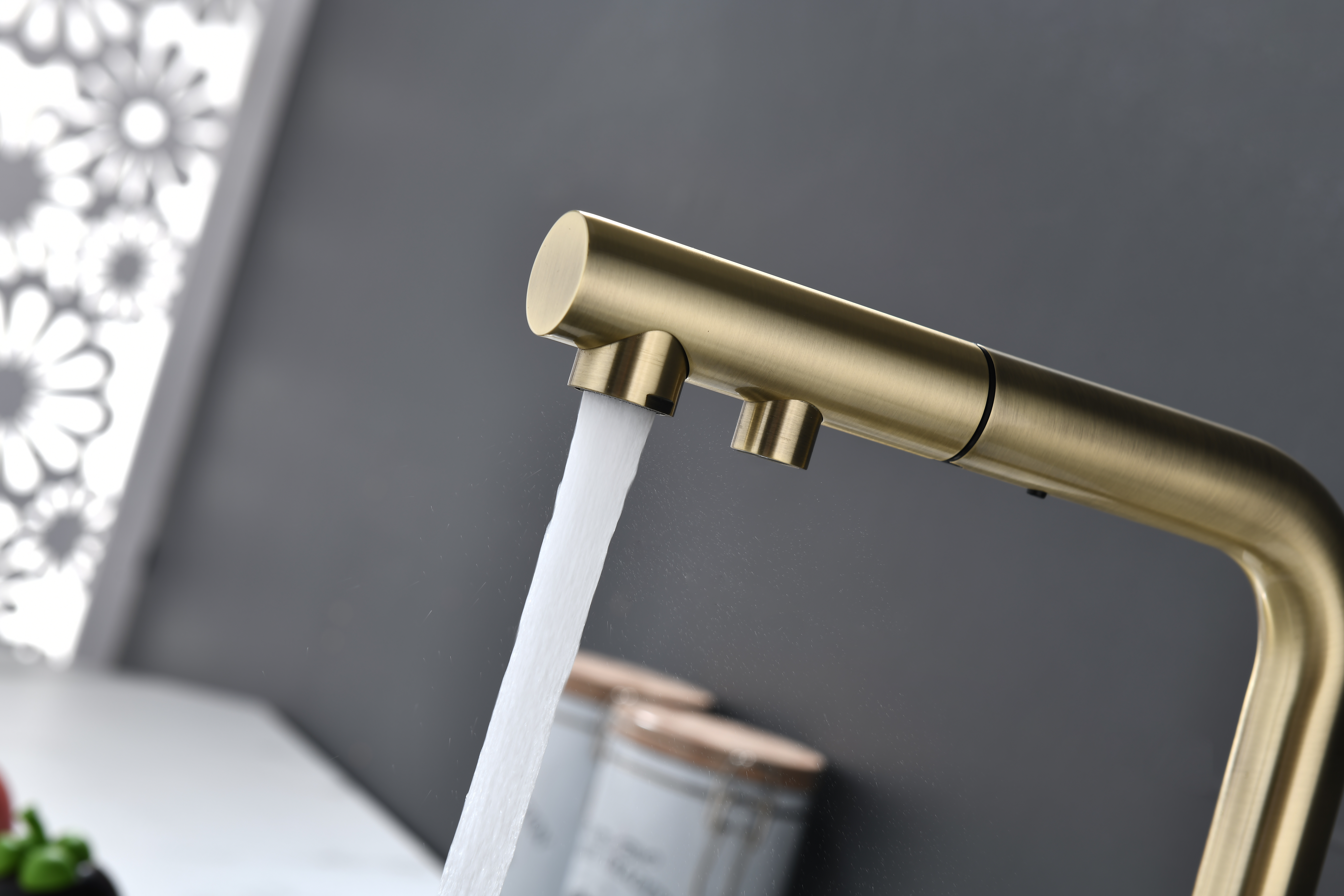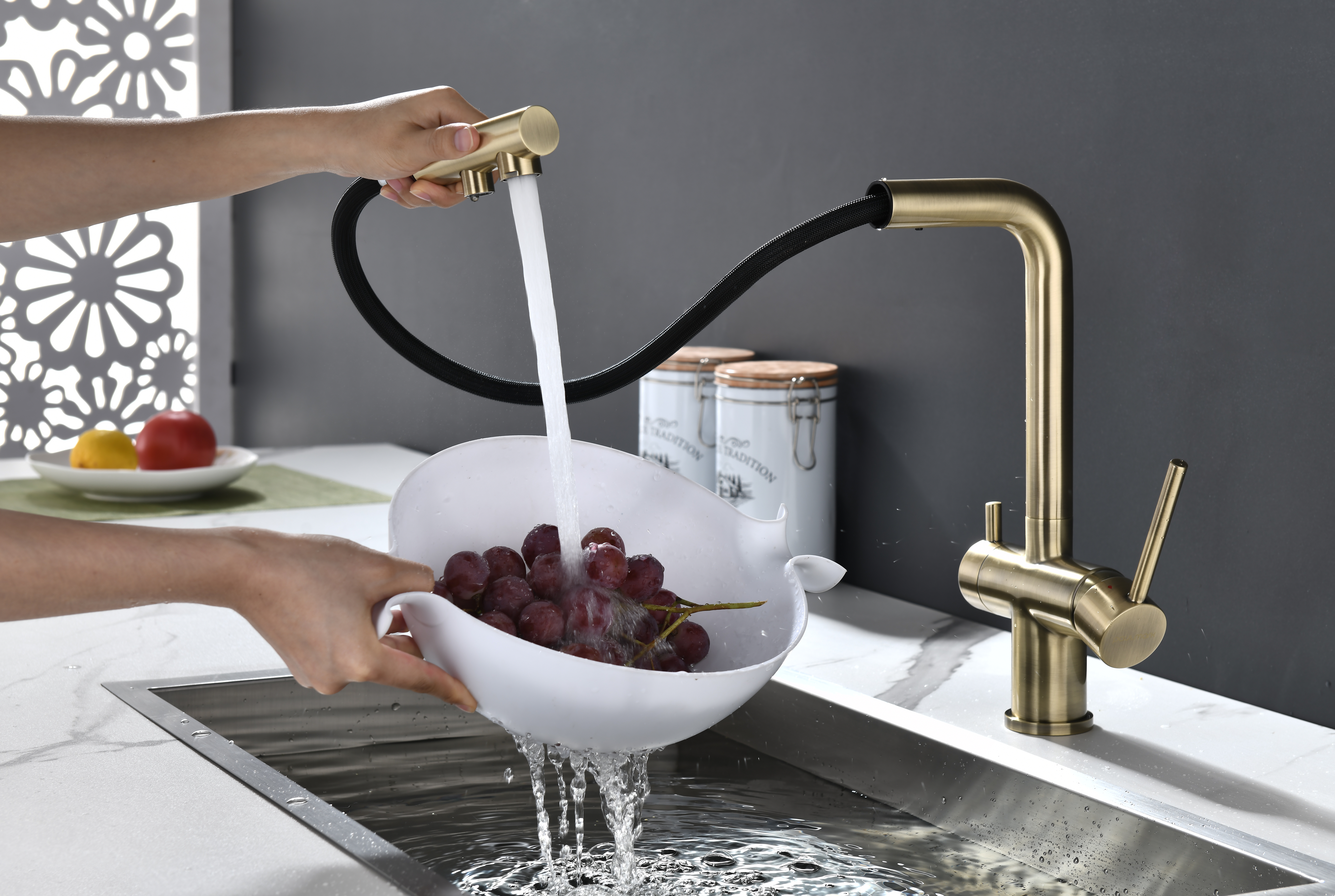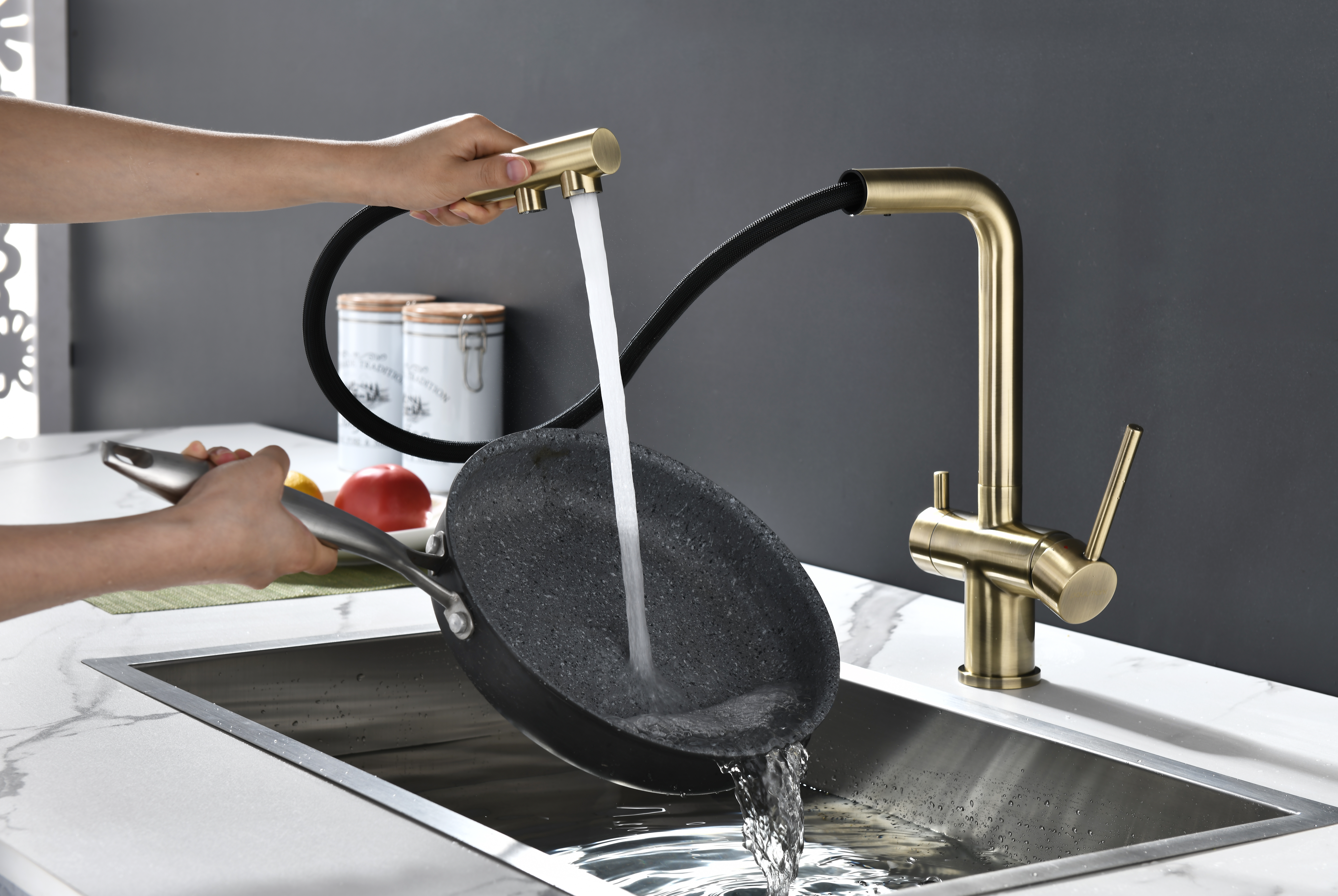 Смеситель оснащен гибким выдвижным изливом из нейлоновой оплетки, которая обладает отличной устойчивостью к истиранию и разрушению. Данная техническая особенность расширяет рабочую зону смесителя, позволяя пользоваться им с удобством в больших мойках, мойках с двумя чашами, или наполнять водой ёмкость на столе рядом с мойкой, в том числе питьевой водой.