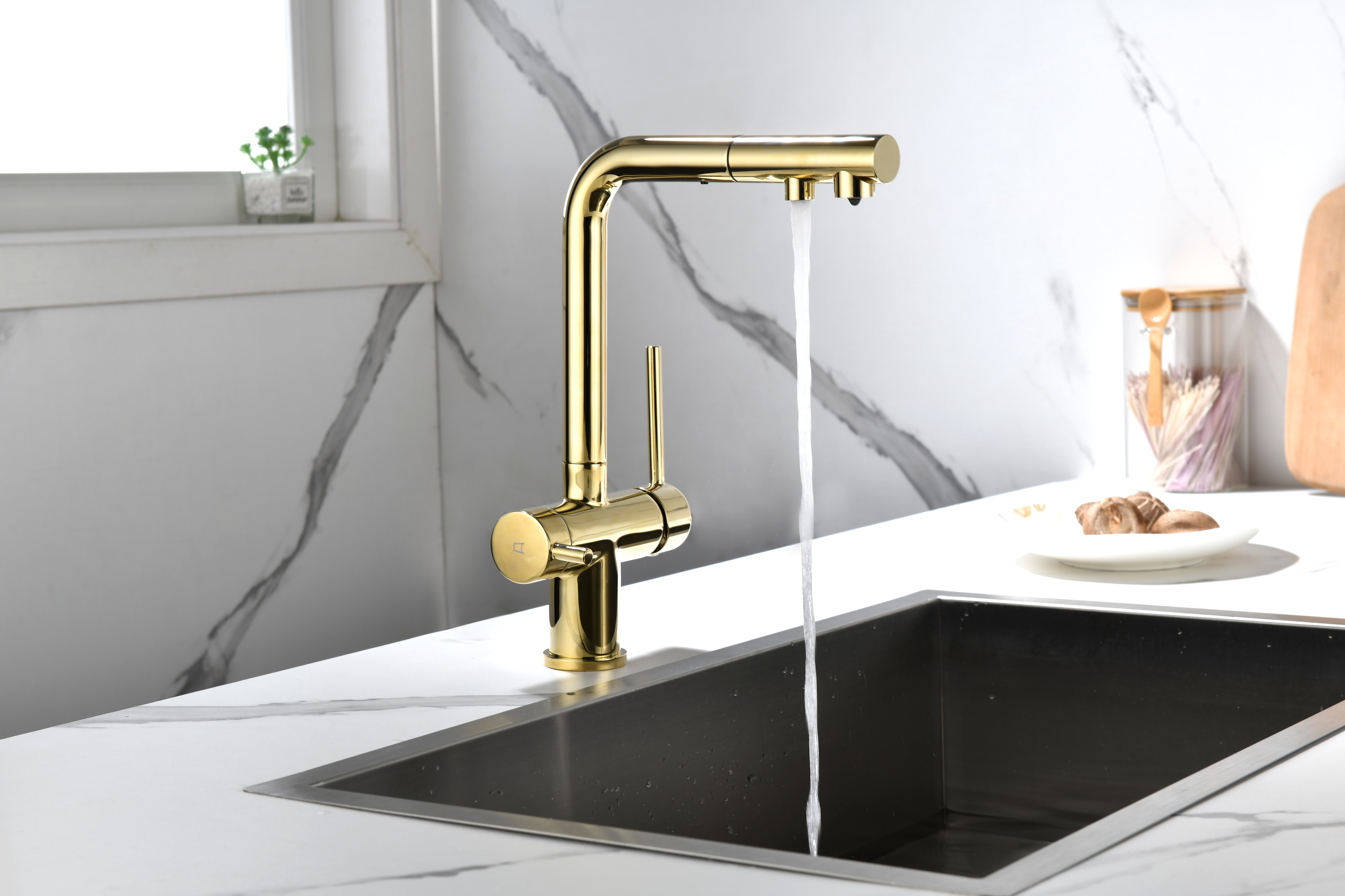 SERPENTINE оснащён функцией TRINKWASSER - излив смесителя имеет встроенный независимый канал для питьевой воды из фильтра, таким образом питьевая и водопроводная вода не смешиваются. Управление питьевой водой осуществляется отдельным рычагом, расположенным слева. Для пуска водопроводной воды используется большой рычаг справа.