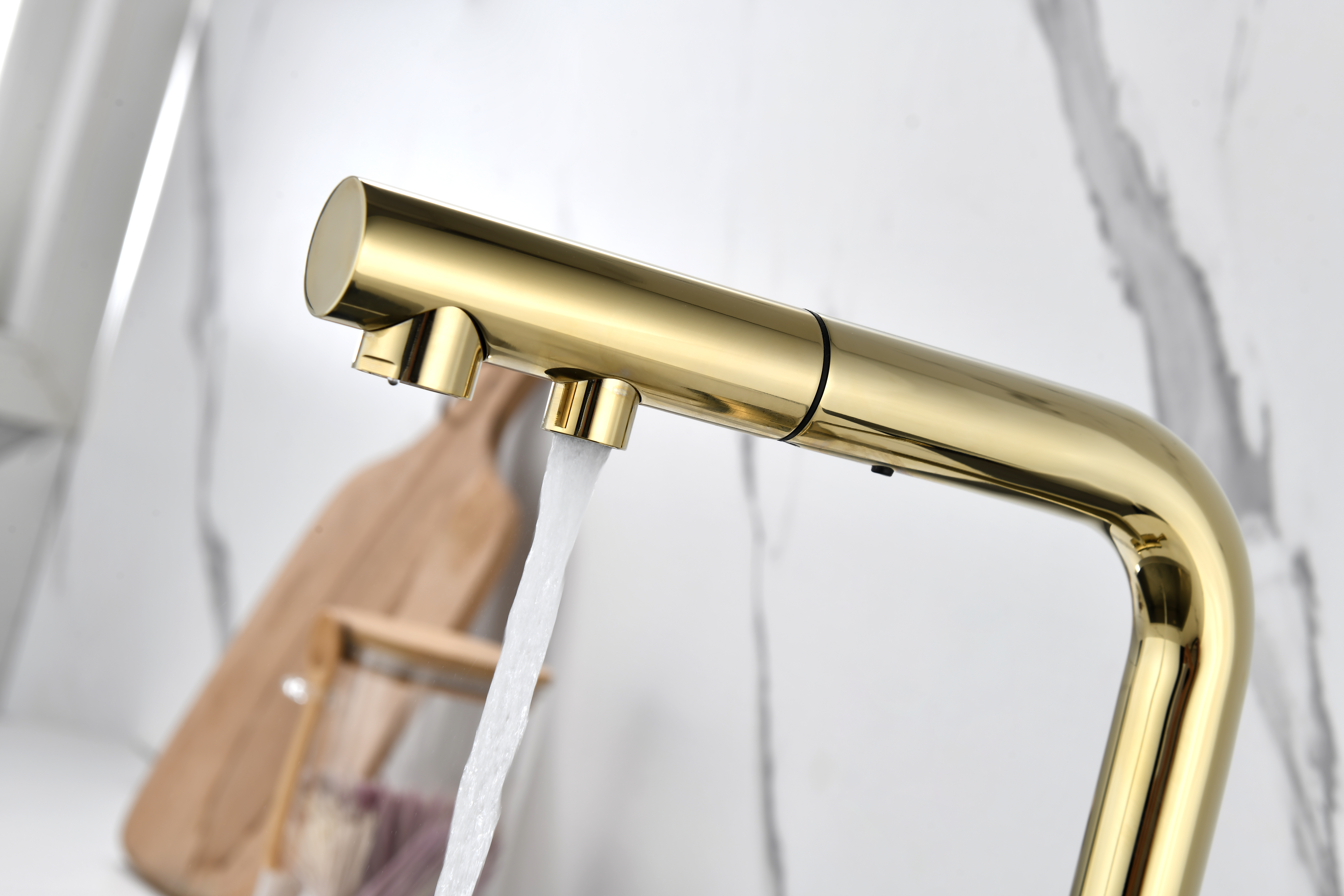 Смеситель оснащен гибким выдвижным изливом из нейлоновой оплетки, которая обладает отличной устойчивостью к истиранию и разрушению. Данная техническая особенность расширяет рабочую зону смесителя, позволяя пользоваться им с удобством в больших мойках, мойках с двумя чашами, или наполнять водой ёмкость на столе рядом с мойкой, в том числе питьевой водой.