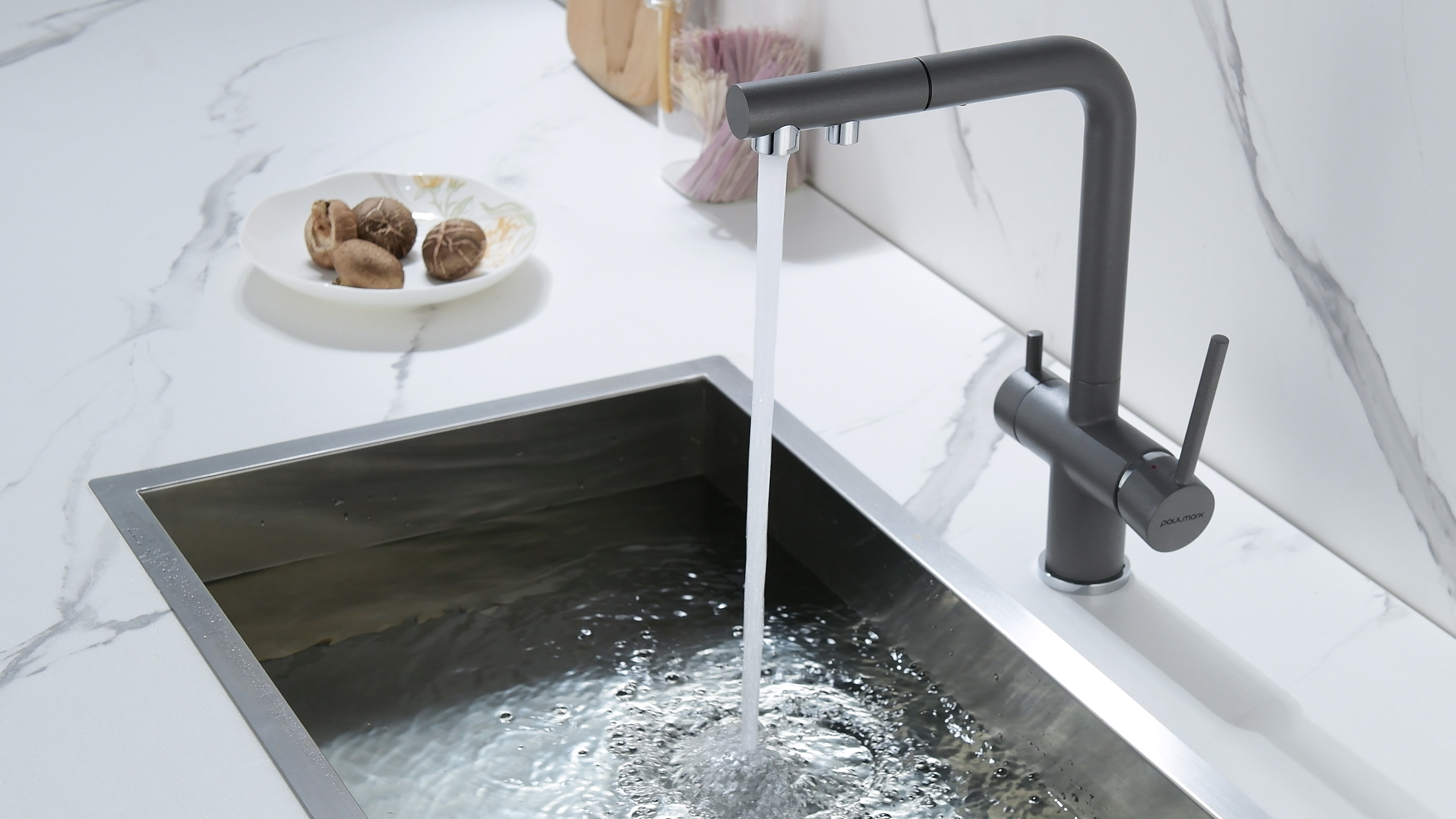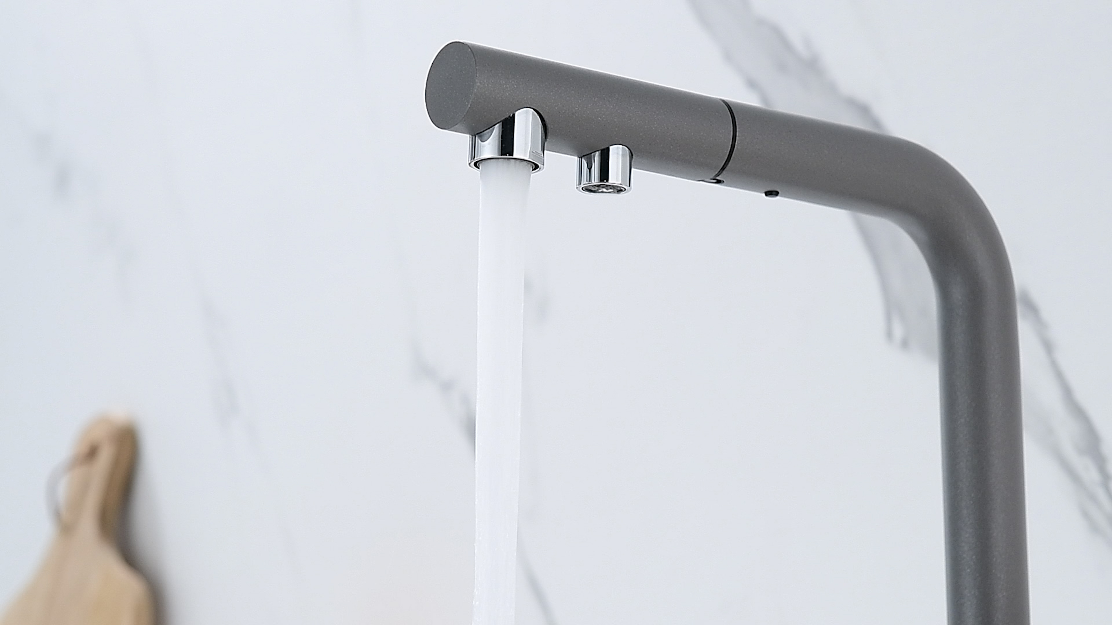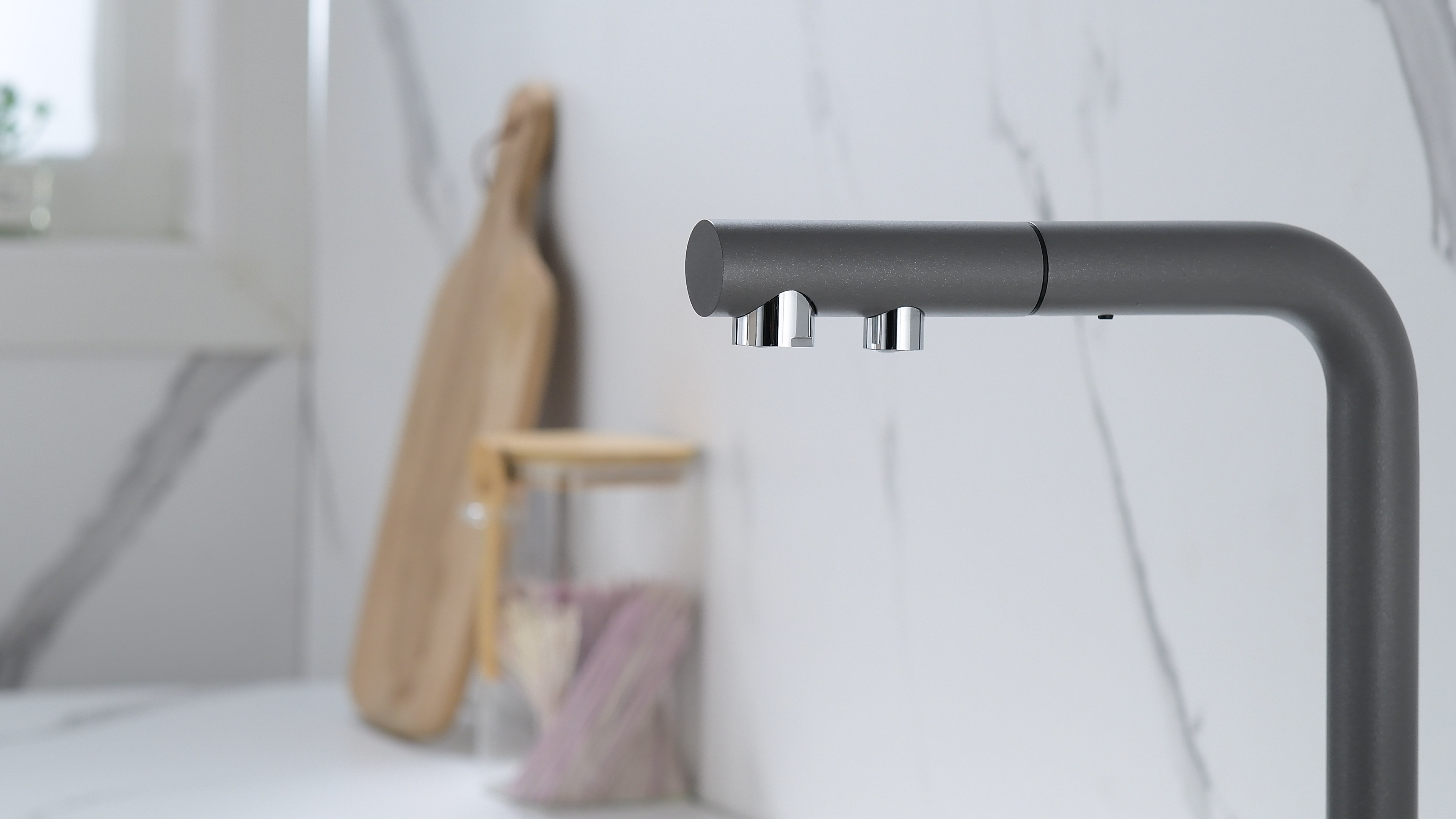 Смеситель оснащен гибким выдвижным изливом из нейлоновой оплетки, которая обладает отличной устойчивостью к истиранию и разрушению. Данная техническая особенность расширяет рабочую зону смесителя, позволяя пользоваться им с удобством в больших мойках, мойках с двумя чашами, или наполнять водой ёмкость на столе рядом с мойкой, в том числе питьевой водой.