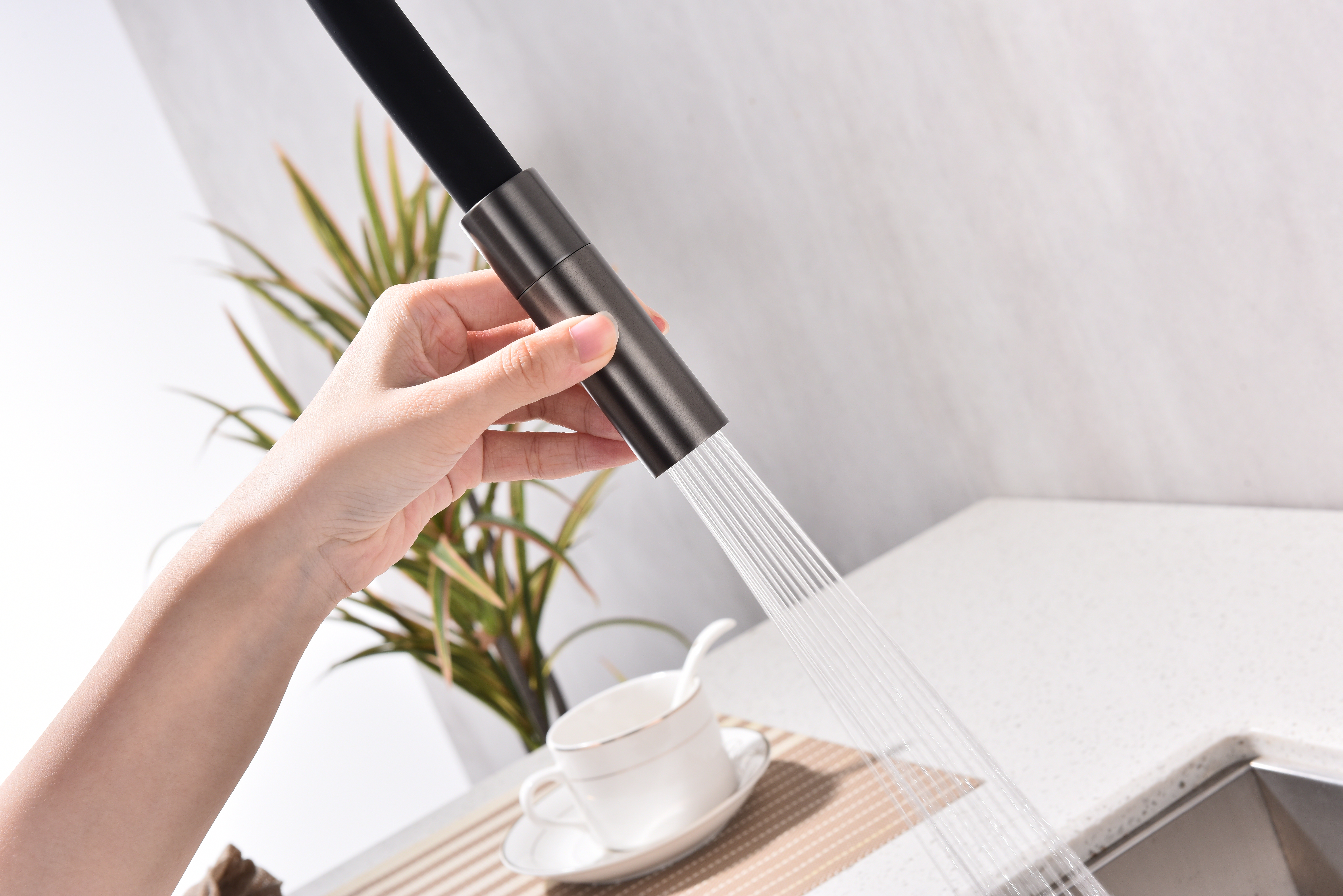 Гибкий силиконовый излив оснащен функцией деликатного душа и магнитным механизмом фиксации в задней части латунного корпуса. Он позволяет ополоснуть посуду или мойку в любой ее части или наполнить емкости даже на столе рядом с мойкой.