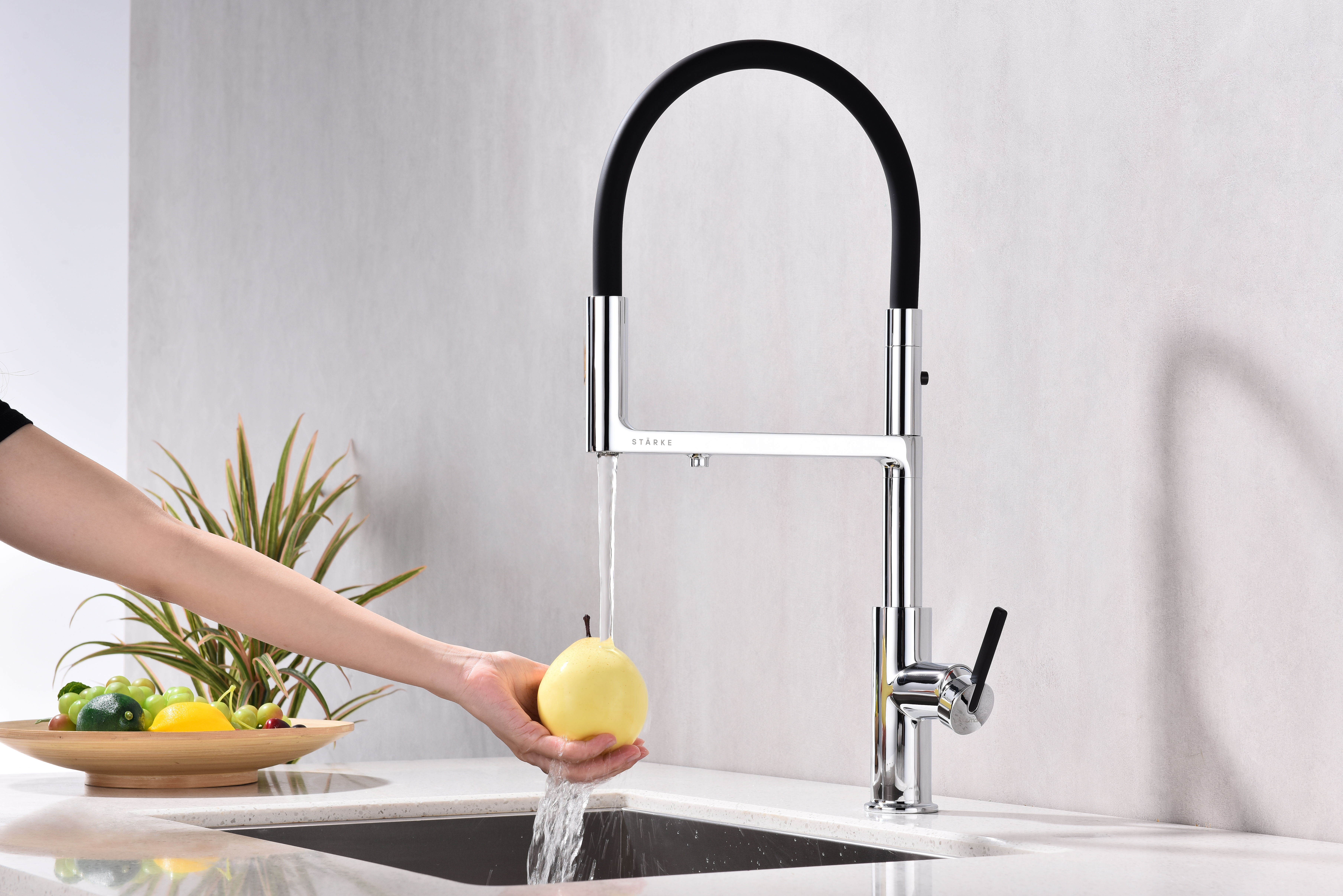 Многофункциональный смеситель для кухни TORNADO – модель премиальной серии «Starke» кухонной сантехники бренда Paulmark изготовлен из высококачественной латуни, которая отвечает высочайшим европейским стандартам качества, не содержит свинца, не разрушается со временем и безопасна для здоровья.