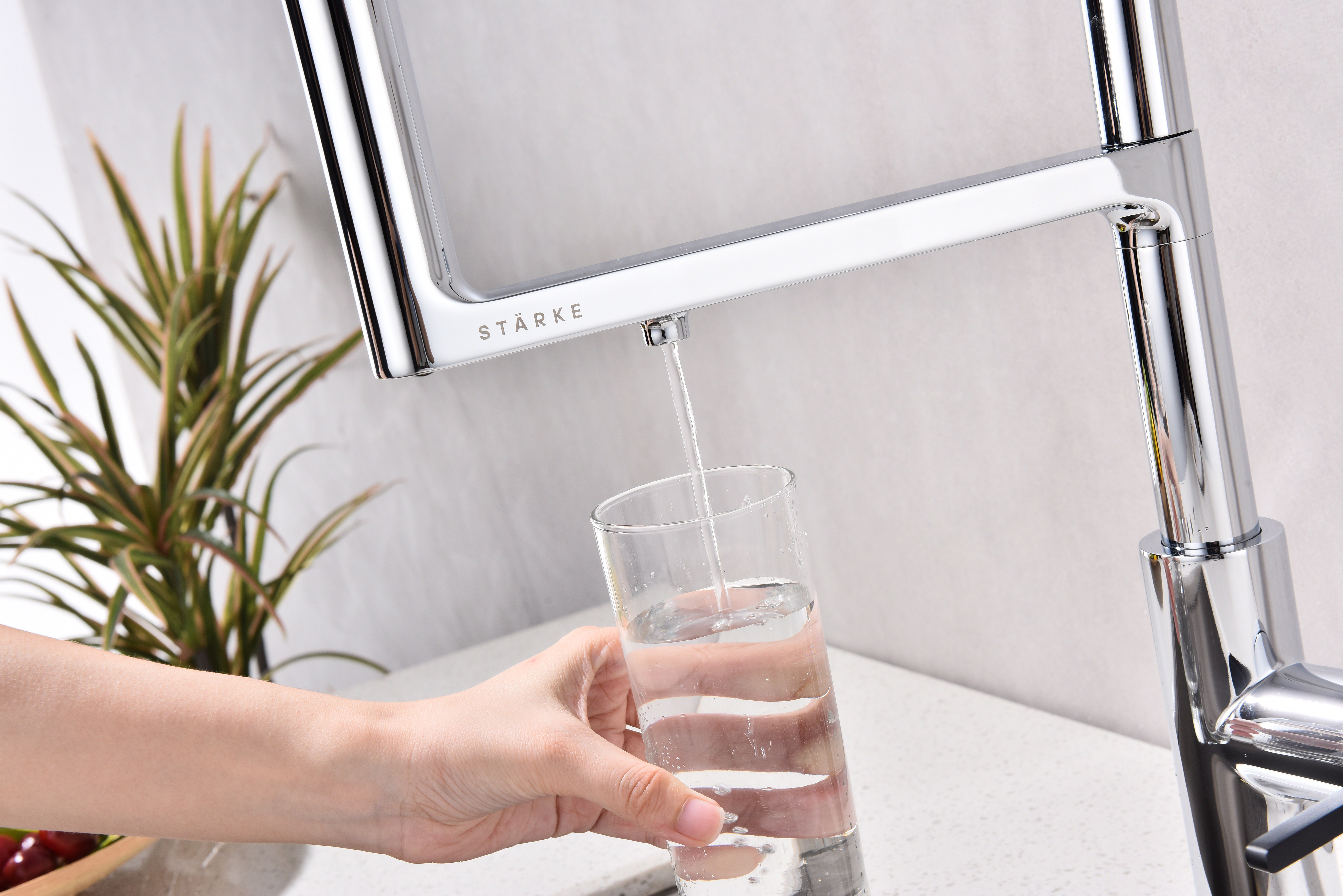 TORNADO оснащён функцией TRINKWASSER – в смесителе присутствует встроенный независимый канал для питьевой воды из фильтра, которая подается из отдельного аэратора на латунной части излива. Водопроводная вода подаётся из гибкого силиконового излива. Управление питьевой водой производится рычагом слева. Рычаг справа управляет подачей водопроводной воды. Совмещение подачи питьевой и водопроводной воды в одном смесителе избавляет от необходимости ставить дополнительный кран и позволяет сделать зону мойки максимально эстетичной.