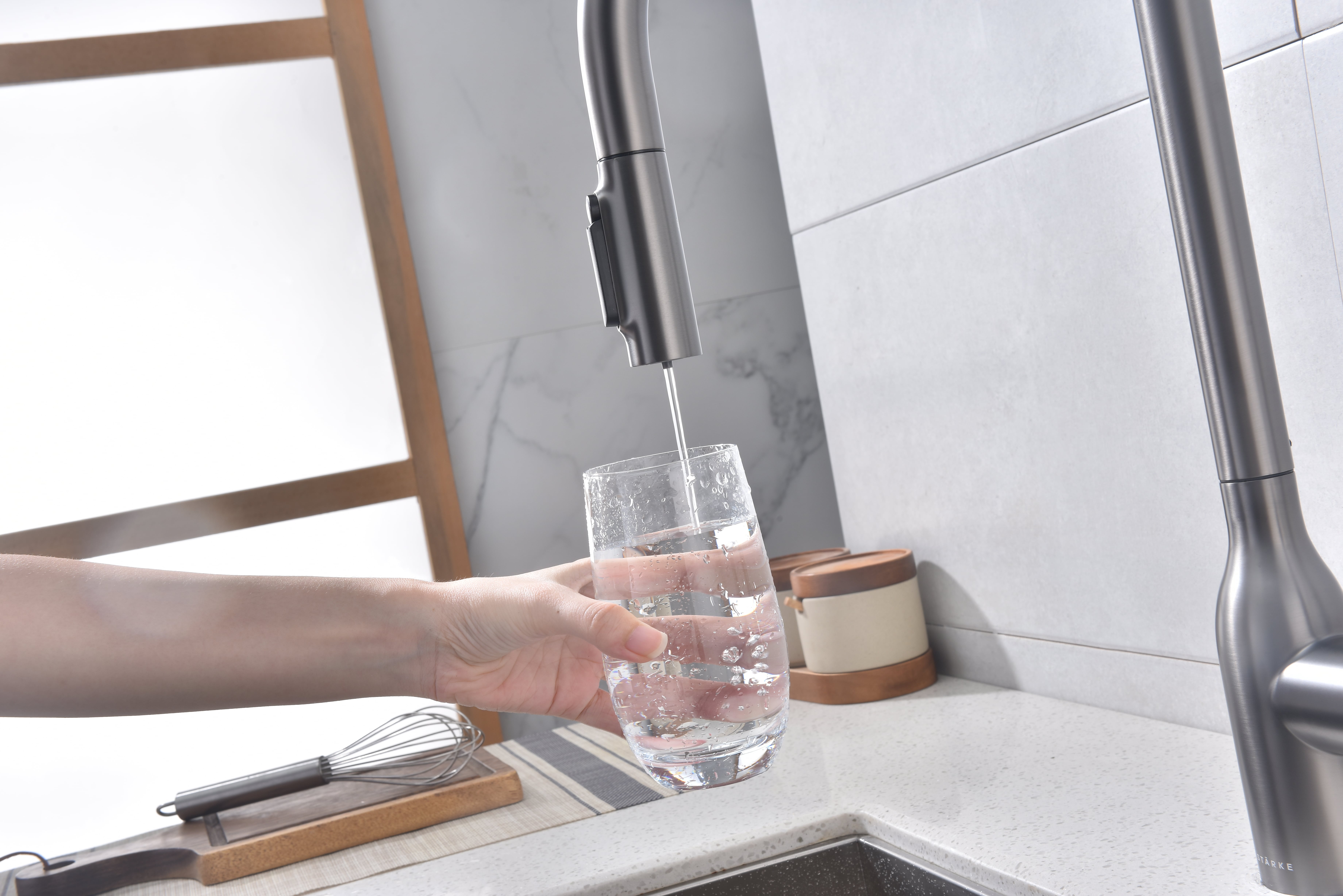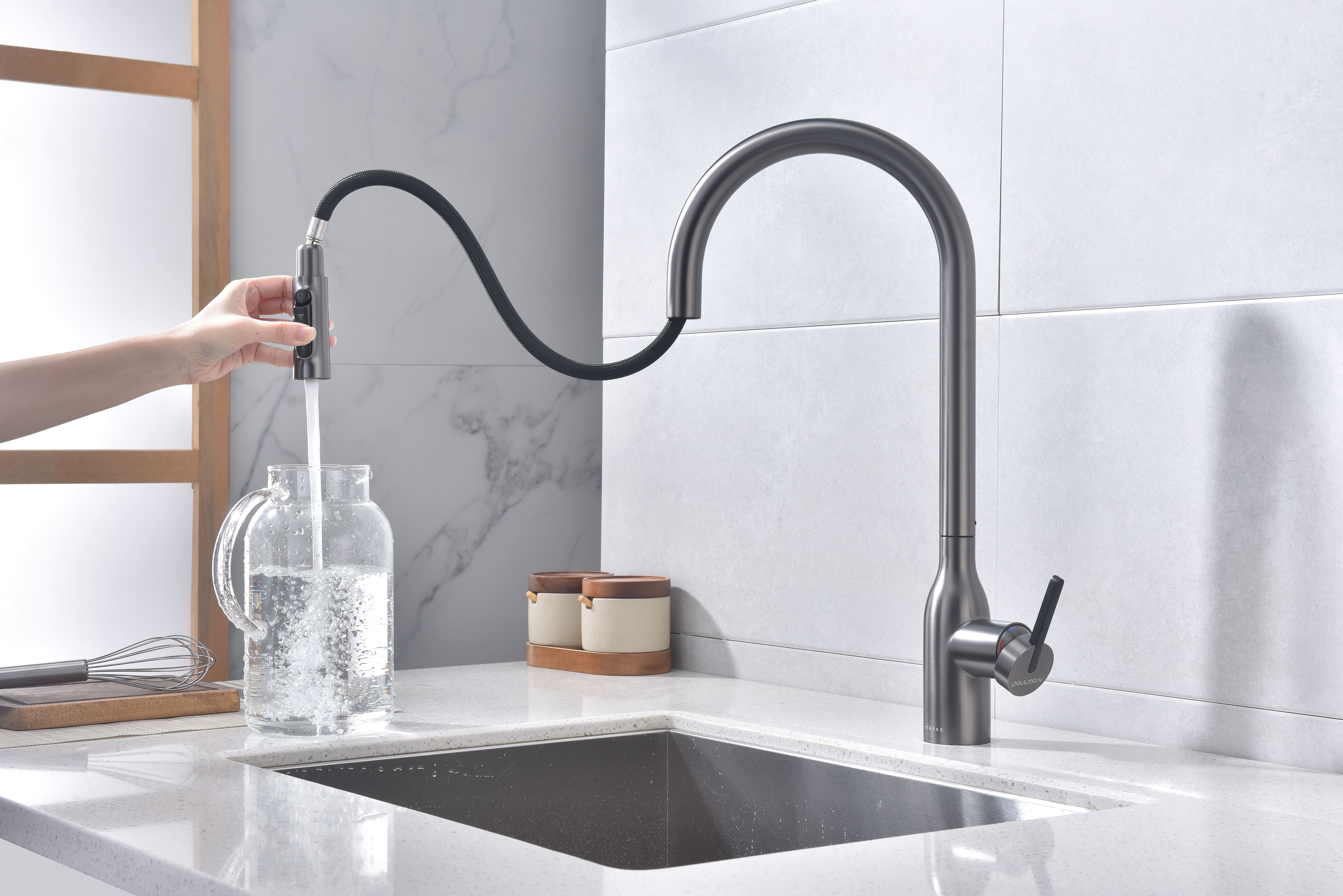 Выдвижной излив дает свободу в наполнении емкостей не только в мойке, но и рядом с мойкой на столешнице. Кнопка на конце излива позволяет управлять подачей питьевой воды и переключением режимов струя / душ одной рукой.