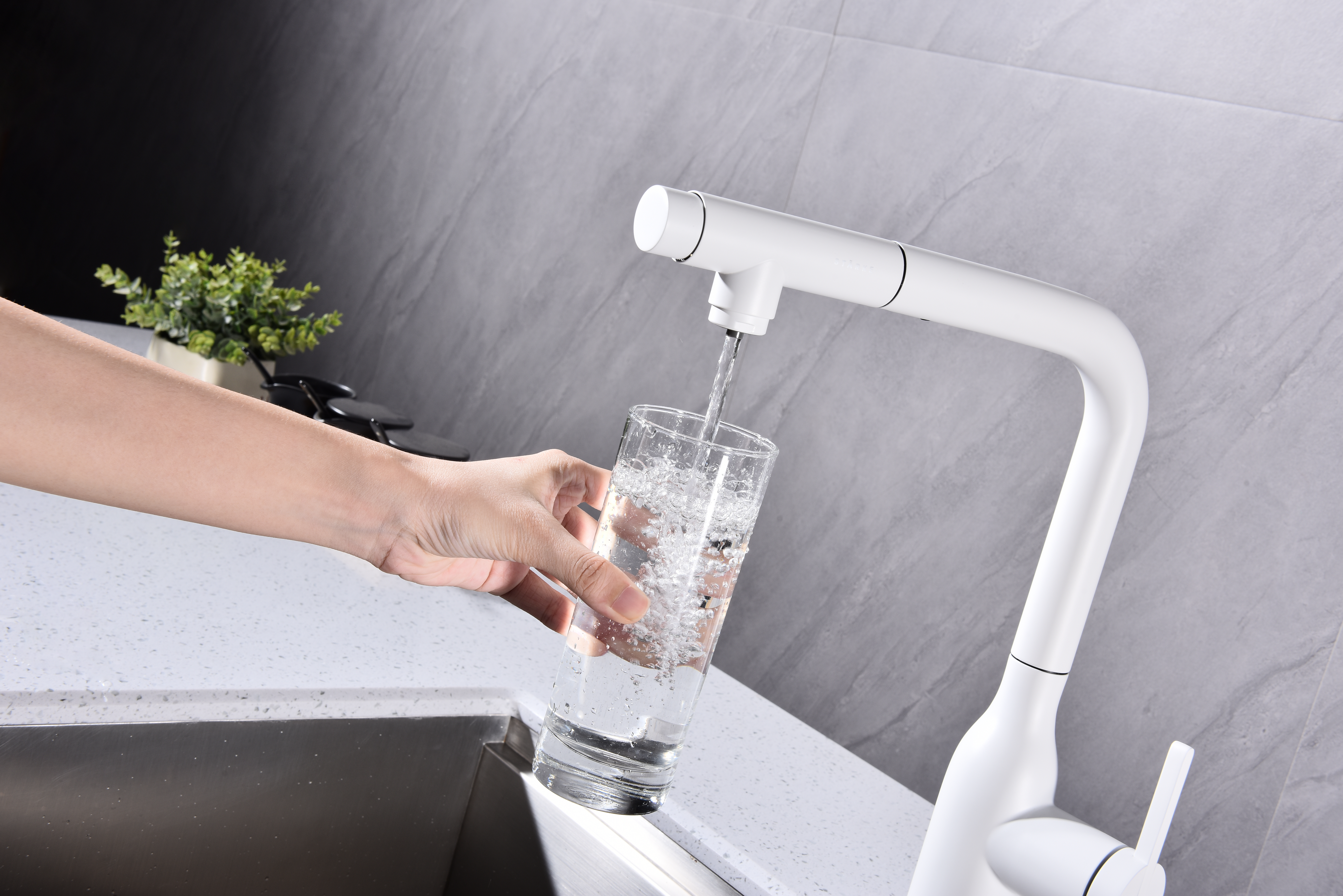 Смеситель VIPER имеет отдельный канал для питьевой воды. Переключение режимов осуществляется с помощью удобной и эргономично расположенной кнопки. Благодаря такому функционалу, потоки воды не смешиваются, а переключение осуществляется максимально комфортно.